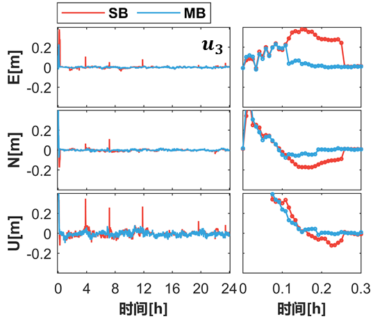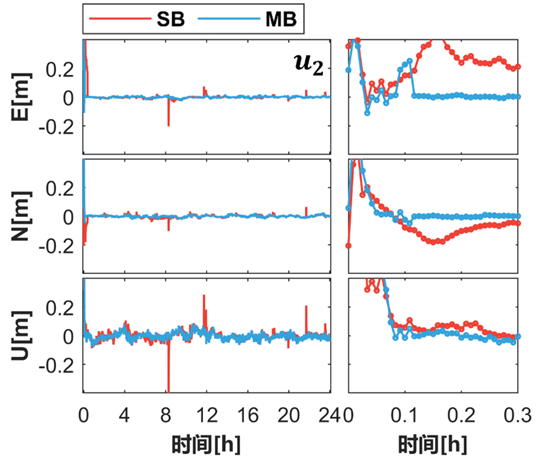 结果显示,在动态解算模式下,MB模型拥有更短的首次固定时间;SB模型的模糊度固定成功率分别为94.6%、96.8%和93.9%,MB模型分别为98.6%、98.6%和98.5%,平均提升3.5个百分点。MB模型在实际工程环境下重收敛性能优于SB模型,有助于缩短信号中断时的重收敛时间。