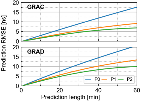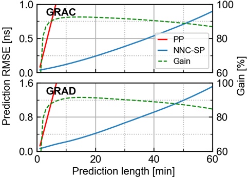 NNC-SP方法首先采用周期多项式(PP)作为物理基准模型,以消除主要的钟差漂移和周期性信号。团队对不同参数配置(无周期项P0、单周期项P1、双周期项P2)进行了系统评估。实验发现,包含12小时和6小时两个主周期项的P2模型虽然能捕捉约90%的信号能量,但在1小时预报时长下,GRAC和GRAD卫星的RMSE仍分别高达6.88 ns和9.95 ns。这一结果表明,仅靠物理模型无法满足未来LeGNSS高精度实时应用的需求,必须引入数据驱动方法对残留的复杂非线性误差进行补偿。