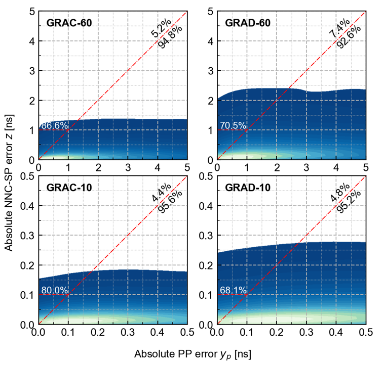 鲁棒性与可靠性:通过误差核密度分析发现,NNC-SP在超过95%的测试样本中表现优于传统模型。对于1小时训练模型,GRAC和GRAD分别有86.6%和70.5%的预报误差被控制在1 ns以内,展现了极强的鲁棒性。